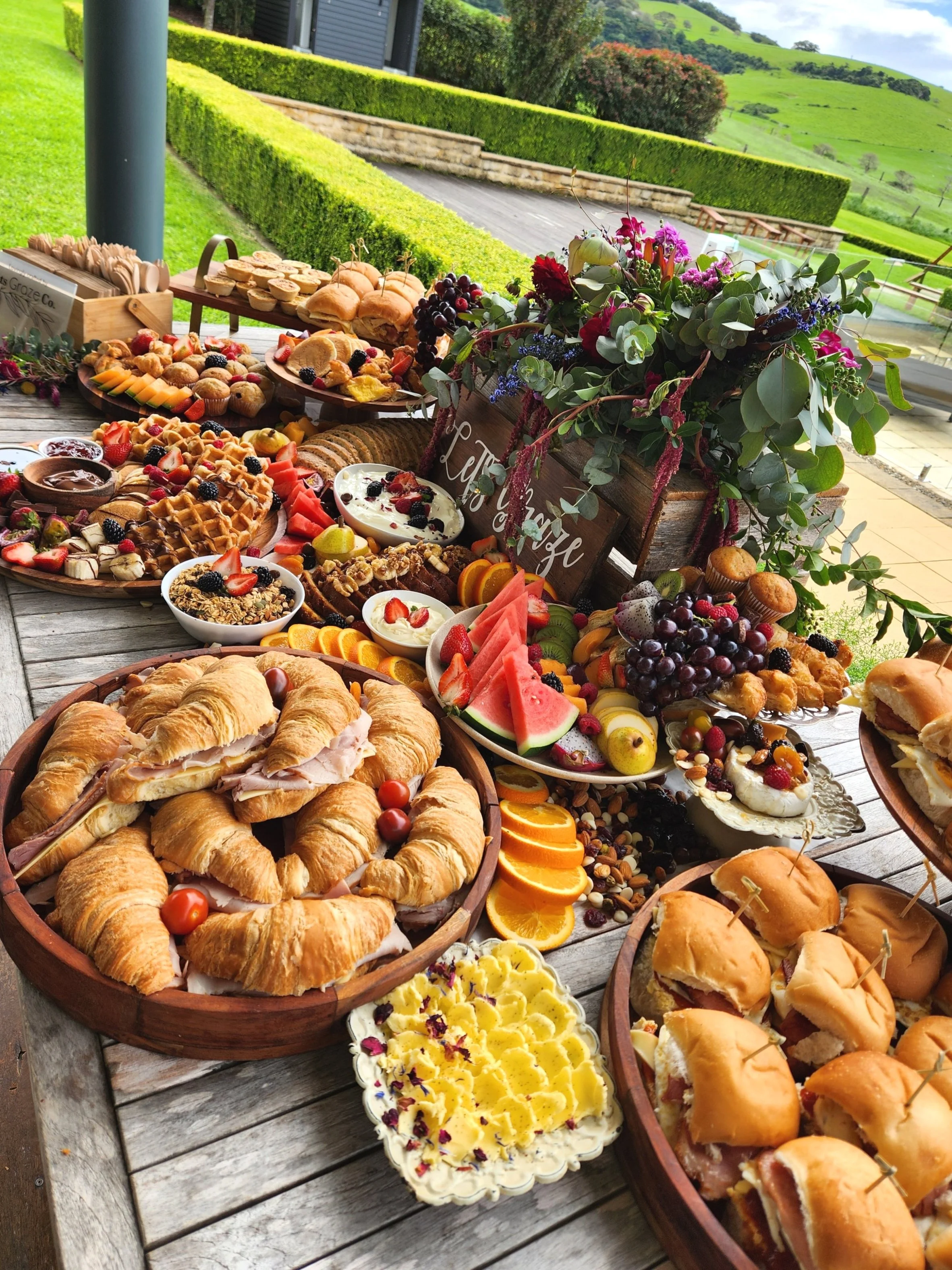 All tables include: our hired serving ware which includes: mini cheese knives, tongs, disposable napkins, cutlery and plates, decor/foliage and styling as well as set-up and pack-down. As well as, a selection of the below delicious items: pastries, danishes and muffins, croissants, yogurt w/ muesli, waffles and maple syrup, pikelets, fresh and dried fruits, nuts, ham and cheeses, boiled eggs, banana and fruit breads. Condiments: Nutella, honey, jam, maple syrup, and fresh cream